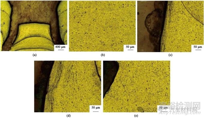 (a) 試樣截面 (b) b區(qū)域 (c) c區(qū)域 (d) d區(qū)域 (e) e區(qū)域