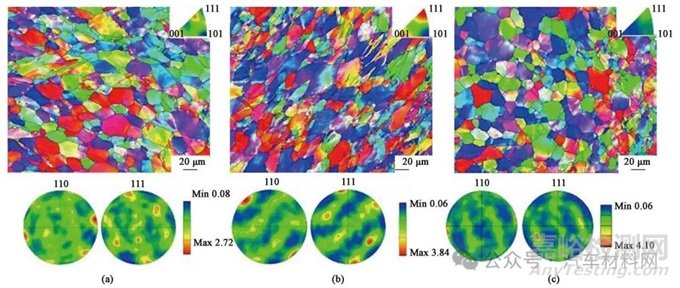 為進(jìn)一步分析鉚接過程中鉚接接頭的顯微組織演變,對接頭剖面組織進(jìn)行EBSD分析,圖6a~圖6c分別為圖5a中b、c和d區(qū)域的取向分布圖和極圖。從取向分布圖中可以看出,在鉚接的過程中,上層和中間層板材在鉚釘?shù)淖饔孟?,發(fā)生了較大的塑性變形,晶粒被拉長變形,中間層板材形成了明顯的纖維狀組織,而底層板材的塑性變形程度小于上層和中間層板材,靠近鉚釘處晶粒呈現(xiàn)明顯的變形組織特征,其他區(qū)域的組織則為等軸晶粒。對不同變形組織的晶界分析發(fā)現(xiàn),上層和中間層板材的晶界主要為小角度晶界(<15°),上層和中間層板材的小角度晶界百分比分別為87.9%和92.3%;底層板材的晶界為大角度晶界(≥15°)和小角度晶界的混合組織,大角度晶界的百分比為28.2%,小角度晶界的百分比為71.8%。小角度晶界主要由變形過程中亞組織如亞晶和位錯胞等構(gòu)成[19]。因此,在鉚接過程中,中間層板材的塑性變形最大,上層板材次之,底層板材最小,其平均晶粒尺寸分別為32.4、26.7和20.3 μm。如圖6中的極圖所示,上層板材織構(gòu)的強度較低,且出現(xiàn)了Copper和Brass S等多種織構(gòu);中間層板材的織構(gòu)強度增強,形成的織構(gòu)主要為Brass S織構(gòu),還存在少量Copper織構(gòu);底層板材的織構(gòu)強度最高,形成的織構(gòu)主要為Copper織構(gòu)。對于面心立方結(jié)構(gòu),Brass S織構(gòu)主要是在剪切力作用下形成的,Copper織構(gòu)一般為軋制態(tài)織構(gòu)[20-22]。