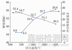 圖3 5Cr5MoSiV1鋼的硬度和沖擊吸收能量隨回火溫度的變化曲線