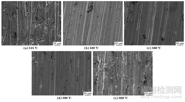 當回火溫度為515,530,560,590,620℃時,試驗鋼的磨損質(zhì)量損失分別為4.002,3.770,3.980,3.864,4.323g??梢婋S著回火溫度的升高,磨損質(zhì)量損失呈先波動下降后升高的趨勢,與硬度的變化趨勢不同,說明硬度和耐磨性能不是正相關(guān)關(guān)系。由圖5可以看出:磨損后試驗鋼表面存在犁溝和剝落坑,不同溫度回火后的犁溝數(shù)量不同且寬窄深淺不等,剝落坑尺寸不一 。當回火溫度為515℃時,試驗鋼硬度較高,基體可以抵抗磨粒的侵入,犁溝的深度較淺、寬度較窄,但是其內(nèi)部應(yīng)力較大,在磨損過程中表面局部位置易發(fā)生斷裂、破碎以致剝落,易產(chǎn)生較大的剝落坑。隨著回火溫度的升高,硬度降低,基體抵抗磨粒侵入的能力降低,犁溝寬度和深度增加,但內(nèi)部應(yīng)力也降低,剝落坑的數(shù)量減少,尺寸減小。但是當回火溫度為620℃時,過低的硬度導(dǎo)致表面犁溝的深度和寬度過大。硬度降低使得表面抵抗磨粒侵入的能力下降,導(dǎo)致犁溝寬度和深度增加,磨損質(zhì)量損失增加;內(nèi)部應(yīng)力的下降可以抑制表面剝落坑的產(chǎn)生和連接,減少磨損質(zhì)量損失。這兩方面的共同作用導(dǎo)致試驗鋼的磨損質(zhì)量損失出現(xiàn)先波動下降后升高的趨勢。推薦5Cr5MoSiV1鋼的回火溫度為 590℃,此時硬度為51.1HRC,沖擊吸收能量為25.7J,磨損質(zhì)量損失為3.864g,試驗鋼兼具良好的沖擊韌性和耐磨性能。