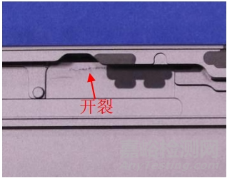 2.外殼裂縫由外側(cè)塑膠底部向內(nèi)腔基材表面擴(kuò)展,縫隙逐漸變?。?/span>