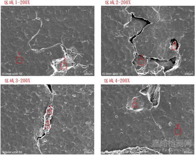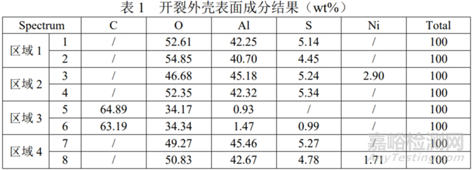 3.區(qū)域3開(kāi)裂處存在異物,EDS測(cè)試結(jié)果表明其主要含C、O元素,推測(cè)該異物可能為塑膠。