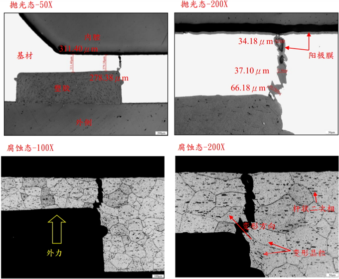 1.裂紋附近陽(yáng)極膜完整,其形貌正常,無(wú)明顯受力破損痕跡;