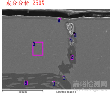 2.裂縫中靠近塑膠位置異物成分與塑膠成分一致,說(shuō)明注塑成型時(shí)該裂縫已存在。