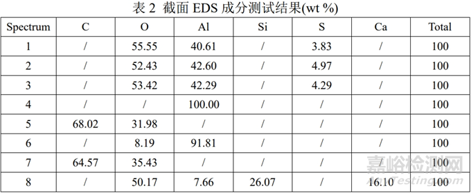1.外殼裂縫中基材表面可檢測(cè)到陽(yáng)極膜成分,且存在較完整的陽(yáng)極膜結(jié)構(gòu),說(shuō)明裂縫在陽(yáng)極制程之前已存在;