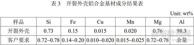 開(kāi)裂外殼鋁合金基材化學(xué)成分符合客戶(hù)要求。