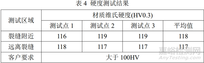 開(kāi)裂外殼裂縫附近硬度與其他位置硬度無(wú)明顯差異,均符合客戶(hù)要求。