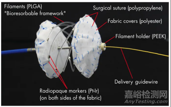 內皮化后,絲狀物緩慢吸收,24 個月后在體外顯示完全吸收。聚酯織物和不透射線標記仍然存在,這可能有助于未來的經皮手術規(guī)劃。該裝置有三種尺寸,可用于閉合 8-22 毫米的缺損。