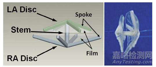 Double Umbrella封堵器由2個傘盤和中間的連接桿組成。左傘盤輻條材料為聚已內酯,右傘盤輻條及連接桿、傘盤的材料為丙交酯己內酯共聚物,具有更好的錨定性及良好的回彈性。