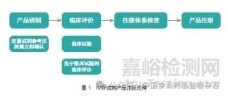 根據(jù)《體外診斷試劑注冊(cè)與備案管理辦法》,首次注冊(cè)的第二類(lèi)、第三類(lèi)IVD 試劑,一般需要進(jìn)行產(chǎn)品研制、臨床評(píng)價(jià)、注冊(cè)體系核查、產(chǎn)品注冊(cè)等環(huán)節(jié),如圖1 所示[1]。在IVD 試劑產(chǎn)品研制階段,注冊(cè)申請(qǐng)人根據(jù)產(chǎn)品用途和技術(shù)特征進(jìn)行IVD 試劑非臨床研究,其中建立和確認(rèn)定量IVD 試劑的參考區(qū)間是關(guān)鍵環(huán)節(jié)之一。IVD 試劑的臨床評(píng)價(jià)主要是采用科學(xué)、合理的方法,對(duì)臨床數(shù)據(jù)進(jìn)行分析和評(píng)價(jià),從而證明試劑的安全性和有效性。根據(jù)《免于臨床試驗(yàn)的體外診斷試劑臨床評(píng)價(jià)技術(shù)指導(dǎo)原則》[3] 和《體外診斷試劑臨床試驗(yàn)技術(shù)指導(dǎo)原則》[4],企業(yè)在開(kāi)展臨床評(píng)價(jià)或臨床試驗(yàn)之前,必須確保產(chǎn)品已經(jīng)定型,包括已完成IVD 試劑的陽(yáng)性判斷值或參考區(qū)間研究。這就要求IVD 試劑參考區(qū)間的確定工作必須在進(jìn)入臨床評(píng)價(jià)階段之前完成,二者存在先后順序。