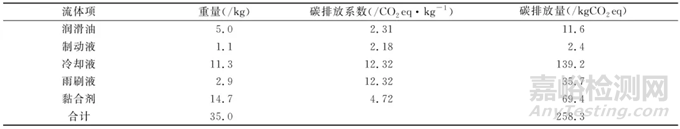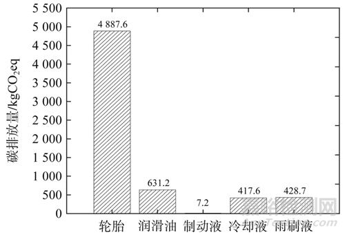 間接碳排放主要體現(xiàn)在汽車日常維護(hù)保養(yǎng),維修階段主要活動主要是更換零部件。汽車在使用階段需要定期更換的零部件有輪胎、流體及電池等。查閱文獻(xiàn)可知各部件在全生命周期中更換次數(shù)分別為:輪胎12次,潤滑油24次,制動液3次,冷卻液3次,雨刷液12次,結(jié)合碳排放因子數(shù)據(jù)[15]可得運行階段間接總能耗為6 372.3 kgCO2eq,其各部分占比如圖2所示。