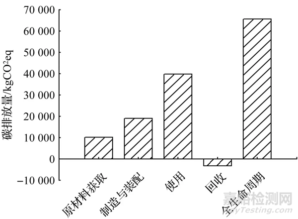 本研究選取理想L8為案例,并提出碳排放生命周期模型,劃分為原材料獲取、制造、使用、回收四大階段,對其整個生命周期中的碳排放進(jìn)行分析。在原材料獲取階段的碳排放總量為10 118.5 kgCO2eq;制造階段的碳排放量為19 087.4 kgCO2eq;使用階段的碳排放為39 687.5 kgCO2eq;回收階段碳排放為-3 305.7 kgCO2eq。將理想L8生命周期各階段碳排放量經(jīng)匯總?cè)鐖D4所示。