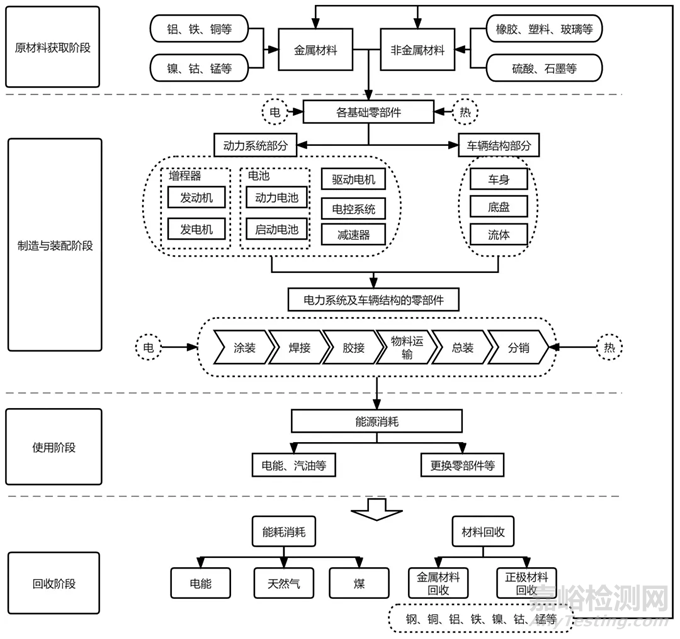 對于電動汽車生命周期的階段劃分,各位學(xué)者給出的方法各有不同,最少的劃分為三個階段,最多的則劃分為五個階段。為了對電動汽車全生命周期過程中碳排放產(chǎn)生的來源進(jìn)行詳細(xì)且合理的分析,本研究綜合分析了國內(nèi)外文獻(xiàn),針對汽車碳排放的階段劃分依據(jù)進(jìn)行了研究和歸類,最終確定對電動汽車全生命周期碳排放影響較大的有原材料獲取、制造與裝配、使用和回收四個階段,系統(tǒng)邊界如圖1所示。