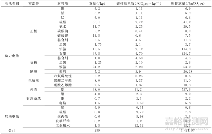 在車輛原材料獲取階段中,增程器(發(fā)動機和發(fā)電機)、驅(qū)動電機、電控系統(tǒng)、減速器、車身和底座各部件組成材料及其碳排放數(shù)據(jù)見表1。電池(動力電池和啟動電池)組成材料及其碳排放數(shù)據(jù)見表2。流圖組成材料及其碳排放數(shù)據(jù)見表3。通過其碳排放系數(shù)與重量計算得出碳排放量。