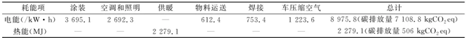 制造階段主要產(chǎn)出物發(fā)生變化,因此制造裝配階段對應(yīng)為過程碳耗CP,該階段主要包括原材料到零件和整車裝配兩個過程。主要能源消耗活動有涂裝、空調(diào)運轉(zhuǎn)、照明、供暖、物料搬運、車間壓縮空氣。在制造裝配過程中,主要考慮各部件加工過程中的電能消耗,如表4所示。根據(jù)各零部件在制造過程中的各能耗和總裝階段的能耗清單,如表5所示,可計算出該階段總能耗與總碳排放量。