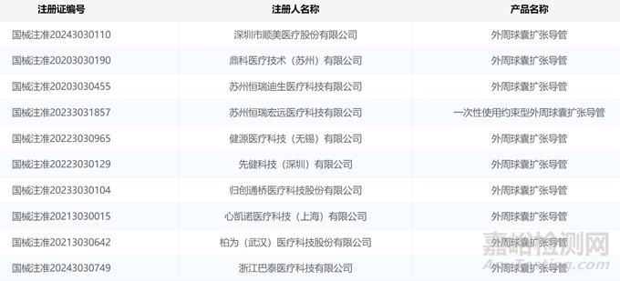 ▲部分已獲批的的國(guó)產(chǎn)外周球囊擴(kuò)張導(dǎo)管