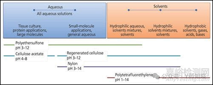 樣品過濾,旨在進(jìn)樣前除去樣品中的顆粒物,該過程普遍存在于樣品制備工作流程中,我們應(yīng)當(dāng)對我們使用的過濾器給予足夠的關(guān)注。過濾器主體和過濾器材料有許多種,使用的樣品性質(zhì)和溶劑種類將決定我們?nèi)绾芜x擇。下圖總結(jié)了典型的過濾材料及其應(yīng)用(溶劑和pH相容性),以表明選擇正確過濾材料的重要性。