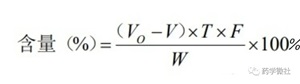 F---滴定液濃度矯正因子,即滴定液的實(shí)際濃度與滴定液中規(guī)定的滴定液濃度的比值。W—供試品的稱樣量,mg。