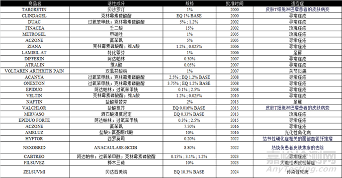 表12000年至2024年FDA批準(zhǔn)的局部皮膚用凝膠劑產(chǎn)品(NDA)