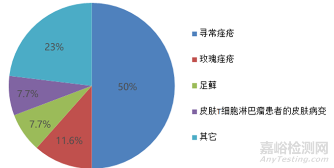 FDA批準(zhǔn)的這26款局部皮膚用凝膠劑NDA上市申請(qǐng)中,適應(yīng)癥以尋常痤瘡居多,占到總數(shù)的一半(即50%)。其次是玫瑰痤瘡(11.6%)、足蘚(7.7%)、皮膚T細(xì)胞淋巴瘤患者的皮膚病變(7.7%)以及其它(23%)。關(guān)節(jié)炎痛、光化性角化病、熱燒傷患者皮膚焦痂的去除、結(jié)節(jié)性硬化癥相關(guān)的面部血管纖維瘤、大皰性表皮松解癥、傳染性軟疣等適應(yīng)癥均各有1款產(chǎn)品。