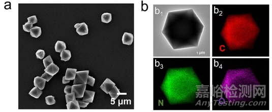 通過掃描電子顯微鏡(SEM)和透射電子顯微鏡(TEM),對CC19粉末的形態(tài)與結(jié)構(gòu)進(jìn)行分析。如圖2所示,CC19粉末的粒徑分布均勻,結(jié)構(gòu)規(guī)則,呈現(xiàn)出微米級的標(biāo)準(zhǔn)八面體結(jié)構(gòu)。能量色散X射線光譜(EDS)分析揭示了C、N和O元素在CC19晶體表面上的均勻分布?;赟EM結(jié)果,采用統(tǒng)計(jì)方法分析了特定數(shù)量的CC19粒徑,從而確定了粒徑分布。研究結(jié)果顯示,粒徑約為4-6μm,粒徑分布較為集中,顯示出較好的一致性。