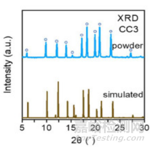 圖3顯示了CC3粉末的X射線衍射(XRD)圖譜,清晰揭示了CC3具有優(yōu)異的結(jié)晶度。CC3晶體在2θ=5.96°、9.85°、12.1°、14.0°、15.3°、17.2°、18.3°、19.9°、20.8°、23.1°、27.2°的衍射峰,分別對應(yīng)CC3的(111)、(220)、(222)、(400)、(331)、(422)、(511)、(440)、(531)和(731)晶面,這些結(jié)果與CC3的模擬衍射光譜和文獻(xiàn)中報(bào)道的實(shí)驗(yàn)結(jié)果一致。
