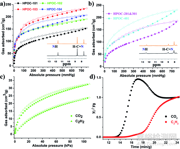圖7.(a, b)196K和760mmHg下腙連接POCs的CO2吸附等溫線;插圖為水穩(wěn)定性試驗(yàn),黑線代表原始樣品,紅線代表在水中浸泡一周后的樣品;(c)298K下的CO2和C2H2吸附等溫線;(d)在298K和1bar下,CO2/C2H2等摩爾混合物在填充床上的實(shí)驗(yàn)突破曲線