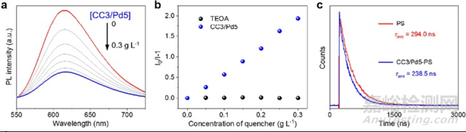 圖9.(a)含有0.4mM PS的CH3CN/H2O(v:v=3:1)溶液在0-0.3g·L-1 CC3/Pd5存在下的熒光光譜,激發(fā)波長為365nm;(b)TEOA和CC3/Pd5猝滅劑的熒光與猝滅劑濃度的關(guān)系的Stern-Volmer圖;(c)PS和CC3/Pd5-PS的時(shí)間分辨PL光譜