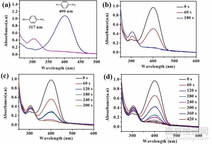 圖10. (a)添加NaBH4前后4-NP的UV-Vis光譜;通過(b)Pd(1.71%)@FT-RCC3、(c)Pd(1.73%)@AT-RCC3和(d)Pd(1.83%)@RCC3將4-NP續(xù)還原為4-AP
