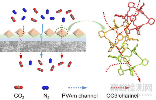 CC3/PVAm/mPSf MMM的選擇性層由PVAm基質(zhì)和CC3填料組成,如圖11所示。盡管PVAm基質(zhì)具有致密的結(jié)構(gòu),但其鏈段的伯胺基團(tuán)可作為反應(yīng)載體,以促進(jìn)CO2通過可逆反應(yīng)轉(zhuǎn)移。與PVAm聚合物基質(zhì)中的曲折通道相比,CC3晶體提供了孔徑為4.9Å的快速氣體傳輸通道,超過了CO2(3.3Å)和N2(3.6Å)的分子動力學(xué)直徑,從而顯著提高了CO2和N2的氣體傳輸效率。此外,氣體分子與膜材料之間的結(jié)合能對氣體分子的轉(zhuǎn)移行為具有顯著影響。一般來說,結(jié)合能的絕對值越大,吸附容量就越高。DFT模擬結(jié)果表明,CC3分子籠中的亞胺基團(tuán)與CO2的結(jié)合能(24.9kJ·mol-1)高于與N2的結(jié)合能(5.1kJ·mol-1),表明對CO2具有一定的親和力。因此,CO2分子優(yōu)先吸附到CC3通道中,然后迅速滲透穿過膜,而N2分子由于孔徑的限制而受阻??偟膩碚f,在引入CC3晶體后,CC3/PVAm/mPSf MMM可以顯著提高CO2滲透率,并保持一定的CO2/N2選擇性。