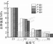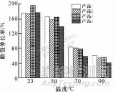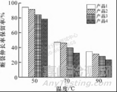 測試不同高溫 (50 ,70 ,90 ℃ ) 下的拉伸強(qiáng)度 或斷裂伸長率,分別除以常溫 (23 ℃ ) 下的拉伸強(qiáng) 度或斷裂伸長率,計算出來的百分比為該溫度下的強(qiáng) 度或斷裂伸長率保留率。