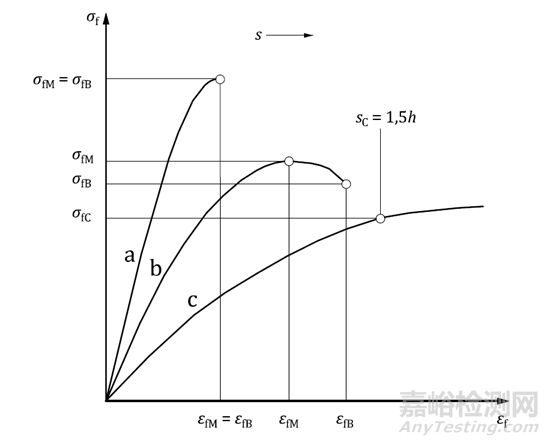 對于這個(gè)問題,我們先來看下您的材料所測得的曲線類型。圖4是ISO 178-2019標(biāo)準(zhǔn)中列出的三種典型的彎曲應(yīng)力-彎曲應(yīng)變(撓度)曲線圖。曲線a代表在屈服之前斷裂的試樣,即脆性試樣,比如纖維增強(qiáng)材料。曲線b代表出現(xiàn)最大力后,在規(guī)定撓度前破壞的試樣。曲線c代表在達(dá)到規(guī)定撓度前既沒有出現(xiàn)最大力也沒有破壞的試樣。