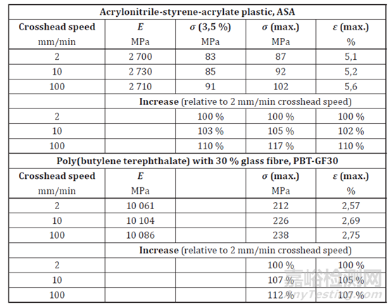表1來自于ISO 178:2019附錄B。從表1中ASA和PBT-GF30兩種材料在不同測試速度下的測試結(jié)果就可以看出,隨測試速度增加,彎曲強(qiáng)度或規(guī)定撓度時(shí)的彎曲應(yīng)力增大。