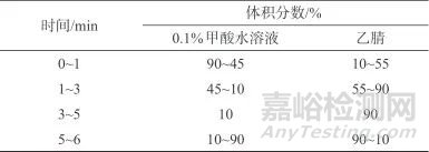 色譜柱:SB-C18柱(2.1 mm×50 mm,1.8 μm,安捷倫科技有限公司);柱溫:35 ℃;流動(dòng)相:A相為0.1%(體積分?jǐn)?shù),下同)甲酸水溶液;B相為乙腈;流動(dòng)相流量:0.3 mL/min;進(jìn)樣體積:1 μL,梯度洗脫,洗脫程序見(jiàn)表1。