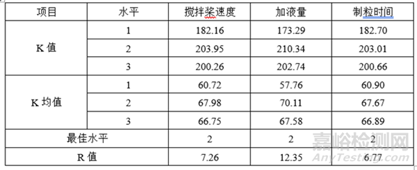 某仿制藥片劑,為濕法制粒工藝的薄膜包衣片。小試研發(fā)過程中在濕法制粒工藝中篩選出的關(guān)鍵工藝參數(shù)有攪拌槳速度、加液量及制粒時(shí)間,采用3因素3水平正交試驗(yàn)設(shè)計(jì)進(jìn)行小試開發(fā)。