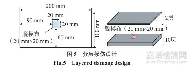 試驗試件大小為200mm×100mm,厚度為12層,采用T700單向預浸料進行正交鋪設,通過在2~3層碳纖維之間添加20mm×20mm的正方形脫模布設置分層損傷,損傷位置如圖5所示。碳纖維復材板試驗件固化工藝流程為:首先將試件加熱至100℃并保溫1h,完成預固化處理;隨后將溫度升至130℃固化2h;最后將溫度升至160℃固化2h。整個固化過程中試件在抽真空條件下施加壓力,以確保樹脂的充分滲透和空氣的排除。