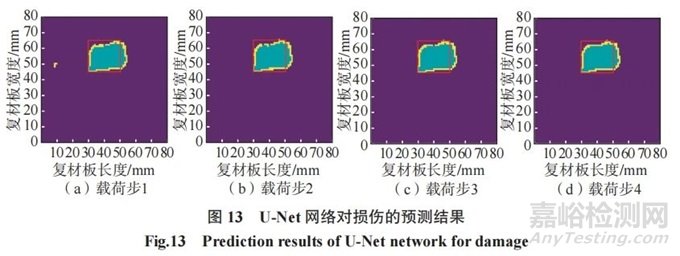訓練集的損失曲線和驗證集的損失曲線如圖11和12所示??梢钥闯?,損失不斷降低并最終趨于平緩,模型訓練表現(xiàn)良好。接下來,使用光纖傳感器測得的真實復材板的表面應變數(shù)據(jù),測試模型對分層損傷的識別效果,網(wǎng)絡模型的預測結果如圖13所示。圖13為U-Net網(wǎng)絡對4個加載等級下復材板試驗件分層損傷的識別結果,紅色框為設計的分層損傷所在位置,黃色和藍綠色區(qū)域為網(wǎng)絡模型的預測結果;根據(jù)網(wǎng)絡模型的測試結果可知,本文所提出的深度學習損傷識別方法識別到了應變數(shù)據(jù)中存在的損傷特征,對分層損傷的位置和形狀有良好的識別準確性,但因為試驗中存在一些誤差,例如復材板切割尺寸不精準、脫模布裁剪與粘貼偏移、光纖布設路徑偏移、光纖標定不夠精確、噪聲等都會對損傷最終的識別準確性有所影響,造成對部分點的誤判,出現(xiàn)損傷邊界位置處識別準確度較低的問題。