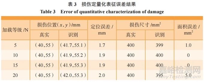 為了更進一步定量描述損傷識別精度,將預測損傷的面積大小和形心位置作為損傷結果定量表征的判定標準,得到如表3所示的誤差分析,最大定位誤差為2.0mm,最大面積誤差為5.0mm2,平均定位誤差為1.9mm,平均面積誤差為1.5mm2。