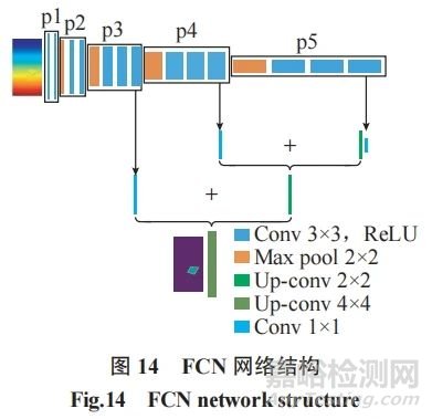 為了驗證U-Net網(wǎng)絡相比于其他深度學習模型的優(yōu)越性,采用另外一種圖像分割網(wǎng)絡FCN進行了分層損傷識別,網(wǎng)絡結構如圖14所示。該網(wǎng)絡結構中包含卷積層、池化層與反卷積層,在反卷積過程中將p5層的輸出進行2倍的上采樣后與p4層的輸出進行逐像素相加,之后進行2倍的上采樣與p3層的輸出再次進行逐像素相加,最后將通過加法獲得的特征矩陣進行4倍的上采樣,獲得與輸入同尺寸的輸出。FCN網(wǎng)絡數(shù)據(jù)訓練時采用與U-Net完全相同的數(shù)據(jù)集,所采用的學習率、迭代批量大小、學習次數(shù)都保持一致。