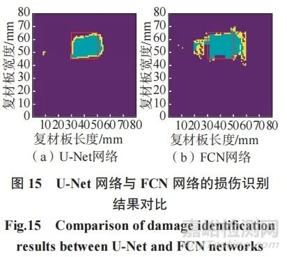 50N加載下的損傷識別對比結果如圖15所示,可以看到,F(xiàn)CN網(wǎng)絡對復合材料分層的識別精度明顯低于U-Net網(wǎng)絡,分割結果不夠精細,并且在無損區(qū)域存在錯誤的損傷預報。其原因是FCN網(wǎng)絡結構跳躍連接主要出現(xiàn)在網(wǎng)絡的后半部分,并不像U-Net在整個網(wǎng)絡中系統(tǒng)地應用;此外,與FCN的矩陣加法不同,U-Net網(wǎng)絡通過其獨特的對稱結構和跳躍連接將下采樣路徑中的每一層輸出與上采樣路徑中相應層級的特征進行通道融合;通過這種方式,系統(tǒng)性地融合不同層次的特征,在圖像分割中保持空間信息的完整性。這使得U-Net在需要精確邊緣細節(jié)的分割任務中表現(xiàn)出更優(yōu)異的性能。