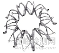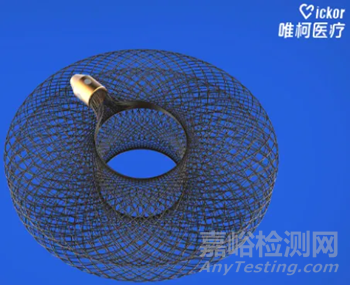 D-shant心房分流器是我國首款自主研發(fā)的植入型心房分流器,由鎳鈦合金絲編織而成的無鉚釘雙盤狀內扣結構,雙盤中央及連接的腰部形成固定直徑及高度的孔道,腰部束型編織技術減少了金屬絲密度,特制編織絲用以加強腰部支撐及分流孔形態(tài)維持,尾端以橫向偏心并貼附于盤面的不銹鋼螺母套收口固定,對產(chǎn)品可回收性進行優(yōu)化,并與輸送系統(tǒng)推送桿頭端的螺絲相匹配用于控制分流器釋放。