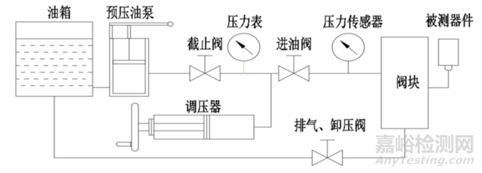 測試系統(tǒng)通過液壓源提供壓力源,通過調(diào)節(jié)閥對壓力調(diào)節(jié),通過接口管道連接被測器件,對被測器件施加壓力,被測器件在壓力作用下,產(chǎn)生相應動作,輸出電氣信號,由測量系統(tǒng)采集記錄。