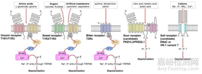 哺乳動(dòng)物和人的舌頭能夠感知的5種基本味覺分別是甜、苦、酸、咸和鮮味。不同味覺的產(chǎn)生機(jī)制并不完全相同,其中甜、苦和鮮味的識(shí)別通常被歸因于味覺受體細(xì)胞,而酸和咸味的識(shí)別則被歸因于味覺受體細(xì)胞上的特定膜通道(圖1)。