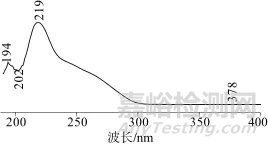 通過二極管陣列檢測器對PMP-氨基葡萄糖衍生物進行考察,圖1為PMP-氨基葡萄糖衍生物特征峰的紫外光譜圖,從圖1中可以看出,該衍生物在219 nm波長處有最大吸收,但是該波長條件下,溶液色譜圖中干擾峰較多,梯度洗脫基線波動較大。在240 nm~260 nm波段,PMP-氨基葡萄糖衍生物仍有較高響應,且峰響應值下降趨勢較為平緩,因此選擇250 nm作為PMP-氨基葡萄糖衍生物的測定波長,與文獻[12]報道檢測波長一致。