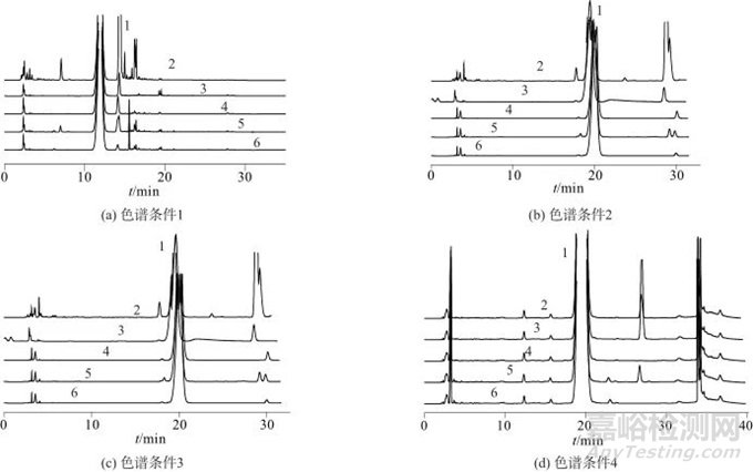 圖2 不同色譜條件下PMP-氨基葡萄糖衍生物色譜圖