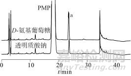 透明質(zhì)酸鈉[11,13-15]酸水解過程:首先多糖結(jié)構(gòu)的β-1,4糖苷鍵處發(fā)生斷裂,生成二糖;第二階段,部分二糖在高溫強酸的環(huán)境下繼續(xù)水解,產(chǎn)生氨基葡萄糖和葡萄糖醛酸;第三階段,幾乎所有二糖全部轉(zhuǎn)化為單糖。在液相色譜分析中通過將D-氨基葡萄糖采用PMP標記后定位,確定了氨基葡萄糖衍生物的峰位(標記該組分為a)。圖3為透明質(zhì)酸鈉水解物色譜圖,從圖3中可以看出,透明質(zhì)酸鈉的水解產(chǎn)物衍生物的峰位與PMP-氨基葡萄糖衍生物峰位一致。