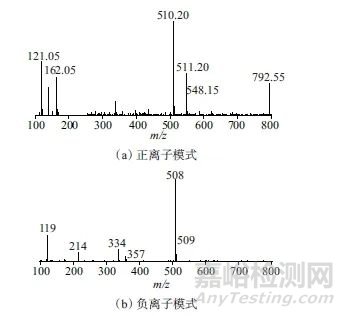 對標記組分a進行正負離子模式下的單級四級桿高效液相色譜質(zhì)譜聯(lián)用儀掃描分析,圖4為PMP-氨基葡萄糖衍生物質(zhì)譜圖,從圖4中可以看出,在負離子模式下均得到標記組分的分子離子峰質(zhì)荷比均為508.2,在正離子模式下均得到標記組分的分子離子峰質(zhì)荷比均分別為510.2、548.2。