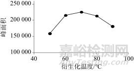 分別選擇衍生化在50、60、70、80、90 ℃條件下進行考察溫度對響應值的影響,圖6為不同衍生化溫度對應的色譜峰面積,從圖6中可以看出,該反應從溫度70 ℃起衍生化趨于平穩(wěn),因此選擇衍生化溫度為70 ℃。