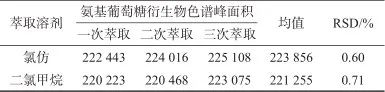 透明質(zhì)酸鈉水解產(chǎn)物衍生化后,需要用適當溶劑將過量的PMP試劑從水相中萃取分離出去,便檢測分析的同時保證衍生物的穩(wěn)定,過量殘留PMP試劑會引起PMP-氨基葡萄糖衍生物的降解。文獻[11-12,14]多采用氯仿作為萃取溶劑,重復萃取3次后用于檢測分析。氯仿為易制毒管制試劑,改用性質(zhì)相近的二氯甲烷作為萃取溶劑,萃取結(jié)果見表3。由表3可知,采用兩種萃取溶劑的衍生物溶液中PMP經(jīng)3次萃取,萃取量達98%,二氯甲烷與氯仿對過量PMP的萃取能力一致。因此選擇二氯甲烷作為萃取溶劑。