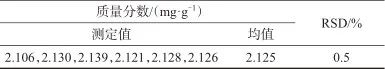 取同一批號透明質(zhì)酸鈉凝膠敷料進行水解并衍生化,平行配制6份樣品溶液,在1.2色譜條件下測定,記錄峰面積,按透明質(zhì)酸鈉對照計算凝膠敷料中透明質(zhì)酸鈉的含量。精密度試驗結(jié)果見表4。由表4可知,測定均值為2.125 mg/g,測定結(jié)果的相對標準偏差(RSD)為0.5%(n=6),表明該方法的精密度良好。